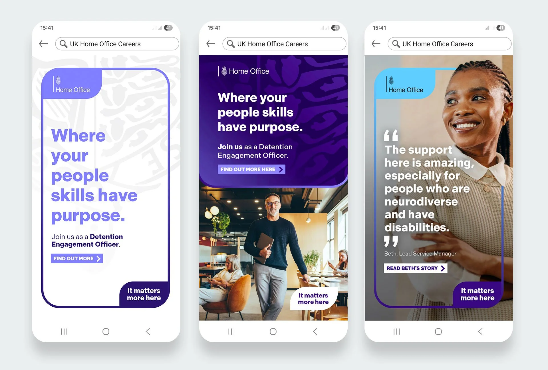 In 2024, the Home Office Resourcing Centre, in partnership with the Home Office’s Communications Directorate, commissioned an agency to produce some design suggestions around a potential employer brand. They liked the key sentiment but felt it required a recruitment agency to take those initial thoughts and develop them into a toolkit.